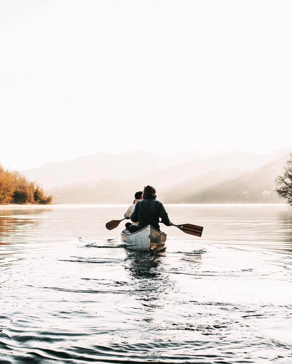 a boat on water. They appear to be canoeing, as indicated by the oars they are using to navigate the waters. The scenery suggests that they might be near