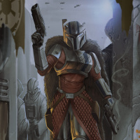 full armor, carrying weapons such as a blaster rifle and pistols, and is walking through what appears to be an alley or ruined area with a stormtrooper helmet nearby on the ground. The character's attire and gear suggest they are prepared for combat or possibly some