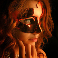 red hair, wearing a black mask. She appears to be gazing intently at something or someone in front of her, and she is holding her hand up near her face as if shielding her eyes from the light. The focus on her mask suggests it might be an important aspect of the image.