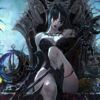 dark attire, possibly armor or a costume, and has a sword resting on her lap. Her right hand is touching her chest, suggesting she might be in the middle of a speech or expression. The setting appears to be a dungeon-like