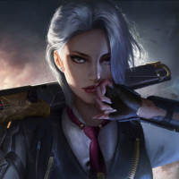 holding guns crossed over her chest. The artwork captures her