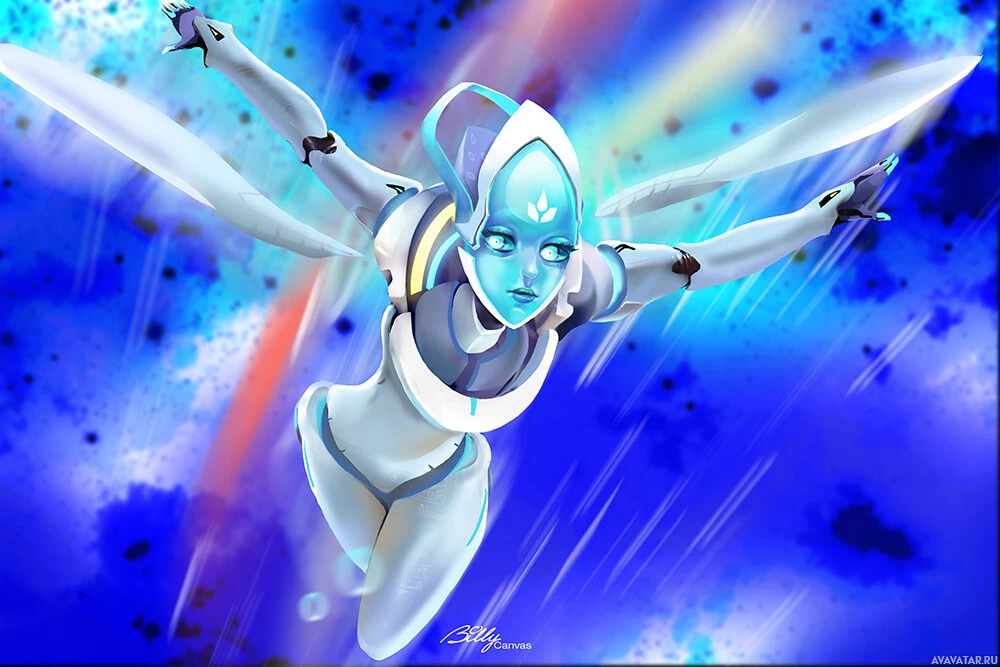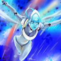 a vibrant background with blue and white hues, possibly suggesting motion or speed. This style of artwork often appeals to fans of science fiction media, where advanced robotics and