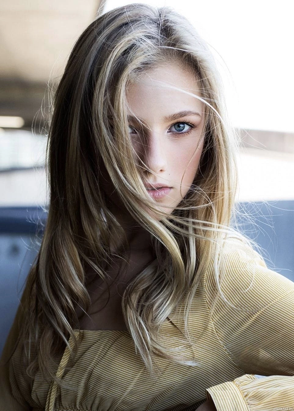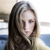 a young woman with long blonde hair, looking off to the side with a neutral expression. She has her lips slightly parted and appears to be looking at something out of frame. The background is not clearly distinguishable, but it seems to be