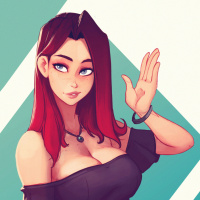 На картинке изображена девушка с рыжими волосами. У нее голубые глаза и она одета в черный топ. Кажется, что девушка машет или жестикулирует правой рукой, возможно, это часть динамичного стиля позирования на иллюстрации.
