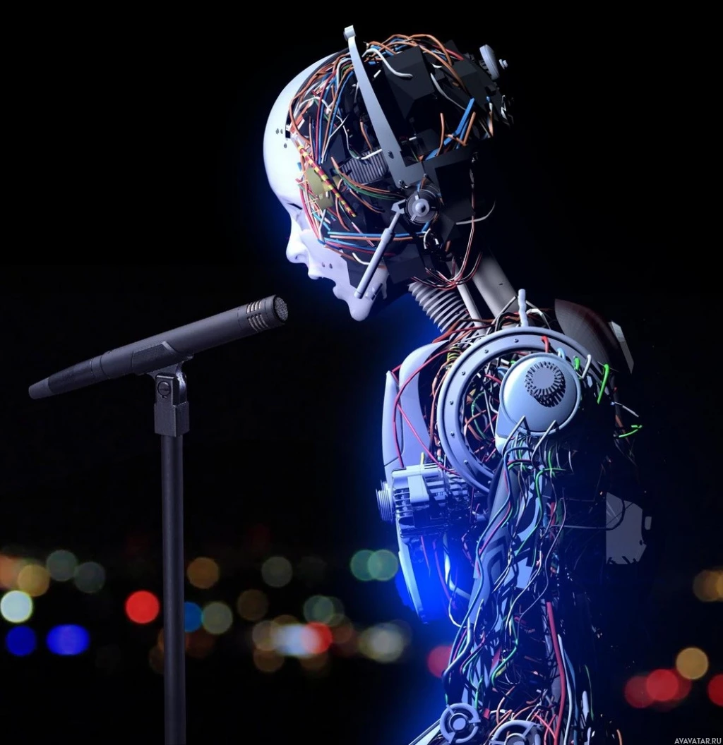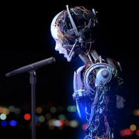 The image features a robot with human-like features standing in front of a microphone. The robot is designed with intricate mechanical and electronic components that give it an advanced, possibly futuristic appearance. Its expression is neutral or slightly contemplative as if it's about to speak or perform. There are city lights visible in the background, which suggests this could be a nighttime