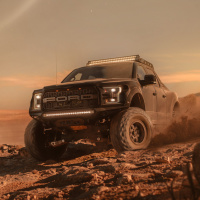 a large crater or dome in the background, suggesting that this might be a location like Mars, although it could also be a desert on Earth. The car is a Ford F-150 Raptor, which is known for its off-road capabilities and