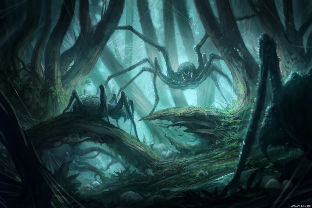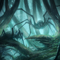 forest scene with spiders. There are multiple spider models visible, some closer to the camera and others in the background, set against a mossy, tree-filled environment that suggests a moist,
