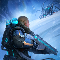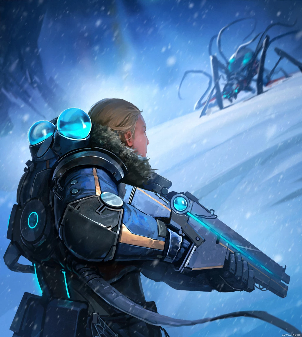 cold weather, as there are snow-covered rocks and ice, and there's a sense of isolation or perhaps preparing for an encounter in this setting.
