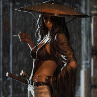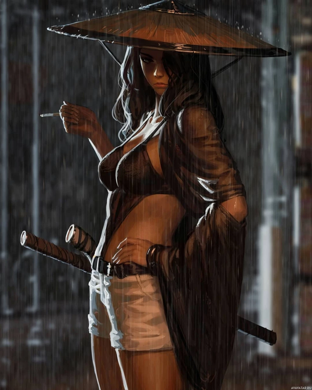 dark hair and is wearing a black hat, a white top with cut-outs, shorts, and appears to be holding a sword in her right hand. Her expression seems serious or intense. There's rain visible in the background, suggesting
