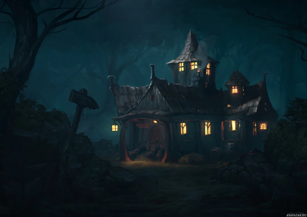 The image features a fantastical-looking house situated in what appears to be a dark and