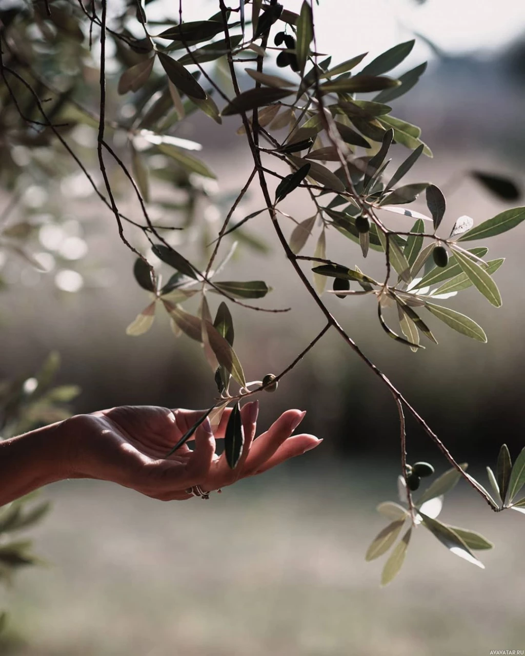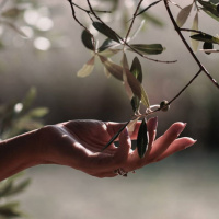 the delicate connection between the hand and the plant. The background is blurred but appears to be