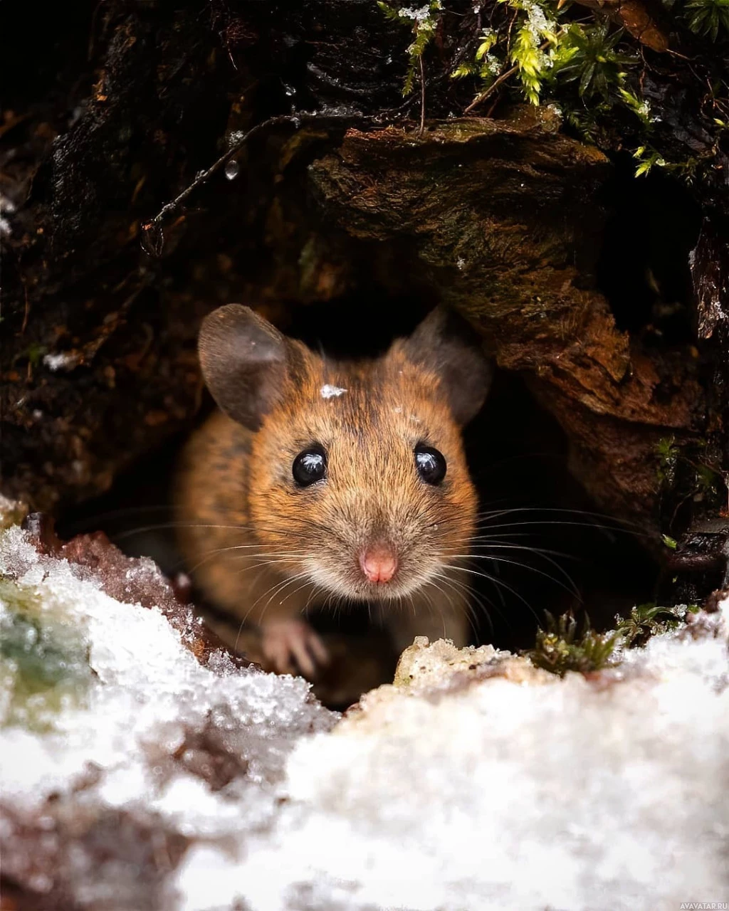 a small mouse peeking out from the entrance of an underground burrow. The mouse appears to have