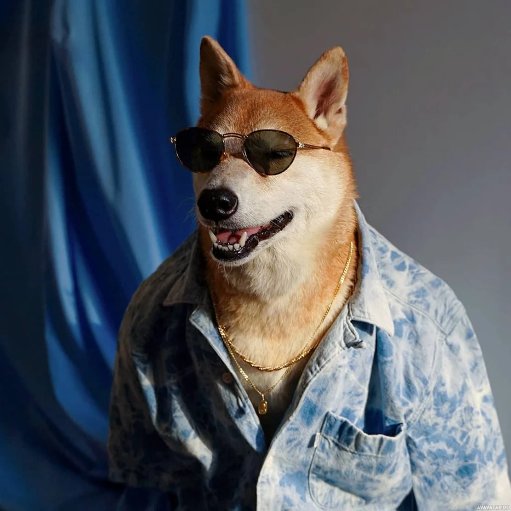 The image features a dog wearing sunglasses, a shirt with floral patterns, and a chain necklace. The dog appears to be posing for the picture, showing off its attire.