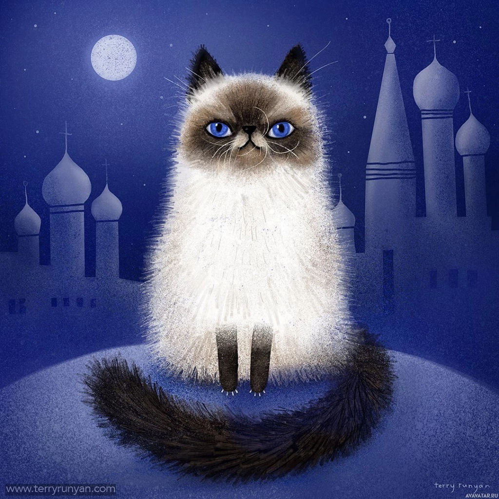 blue eyes and distinctive facial features. The cat is seated upright with its