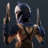a female character dressed in armor reminiscent of the Star Wars franchise, specifically resembling the outfit worn by characters known as "Mandalorians." She is holding two