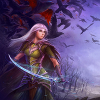 white hair and is equipped with various pieces of armor including gauntlets and boots, suggesting that they might be a warrior or adventurer. They are wielding two swords, which adds to the overall combat-ready appearance. The background features a dark, ominous sky filled with flying creatures that resemble bats, adding to