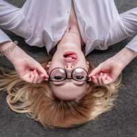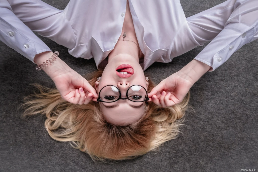 The image shows a woman lying on her back with one leg bent toward the ceiling. She is wearing glasses and seems to be playfully sticking out her tongue at the camera, which gives off a cheeky or lighthearted vibe. Her pose is casual and relaxed, and she's dressed in a style that suggests a professional environment, possibly