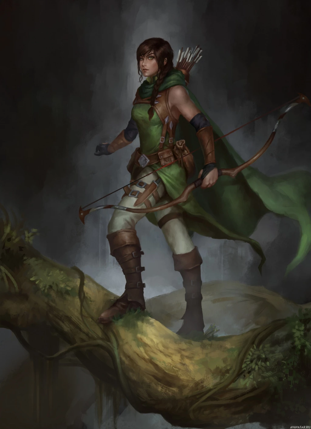 fantasy literature and games. In her hands, she holds a bow, indicating that she is
