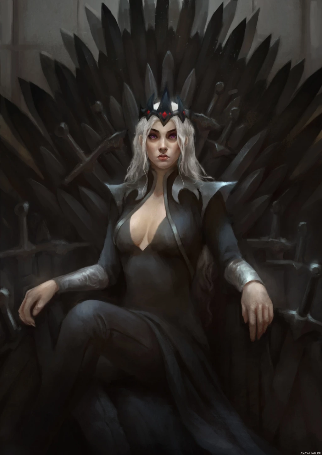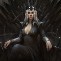 Daenerys Targaryen, who is also referred to by her epithet "the Unburnt," or simply "the Khaleesi" by her followers. She is seated on the Iron Throne in
