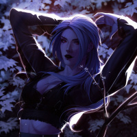 a female character with white hair, sitting amidst what appears to be a forest setting. She has a stylish and modern appearance, with visible tattoos on her arm. The character is wearing a top that is cut off at the waist, revealing a cropped tank top underneath. The artwork conveys a sense of mystique or otherworldliness due to the fantasy-like elements such as the glowing trees and