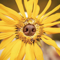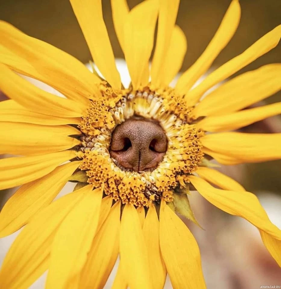 an interesting play on words where the dog is camouflaged as part of the flower, making it appear as if the sunflower has come to life with a face and nose.