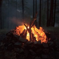 a bonfire in the woods. Surrounding the fire are several trees, indicating that this is indeed within