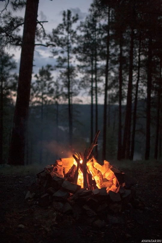 a forest environment. The overall atmosphere of the image is serene and somewhat mysterious due to the low light conditions and the presence of the fire as the main