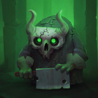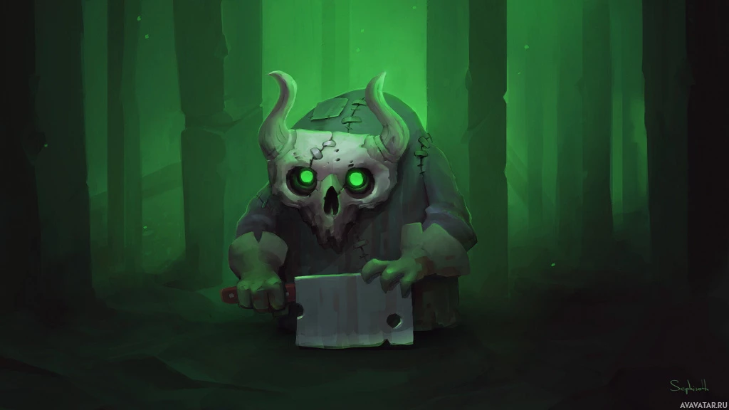 glowing eyes, sitting in what appears to be an ominous forest setting. The creature is holding a tool that could be interpreted as a weapon or a digging implement. The atmosphere of the picture suggests it belongs to