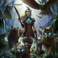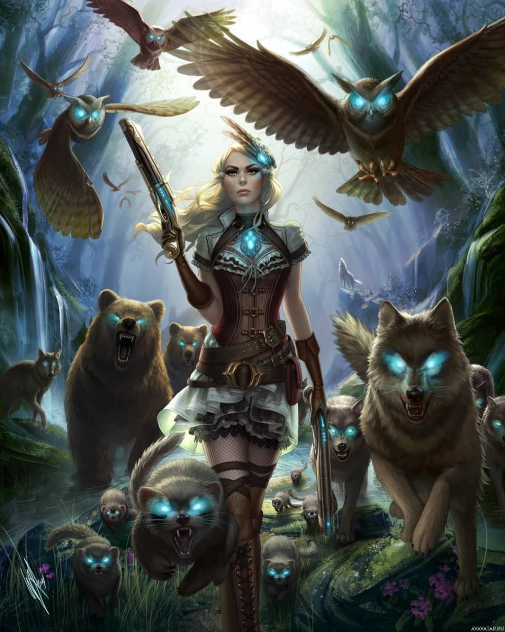 white hair, is holding a pistol, and is surrounded by various creatures such as birds (possibly ravens or crows) and wolves with glowing eyes. There are also other animals in the picture that seem to have magical or mythical qualities to them. The character herself is styled in what looks like armor or