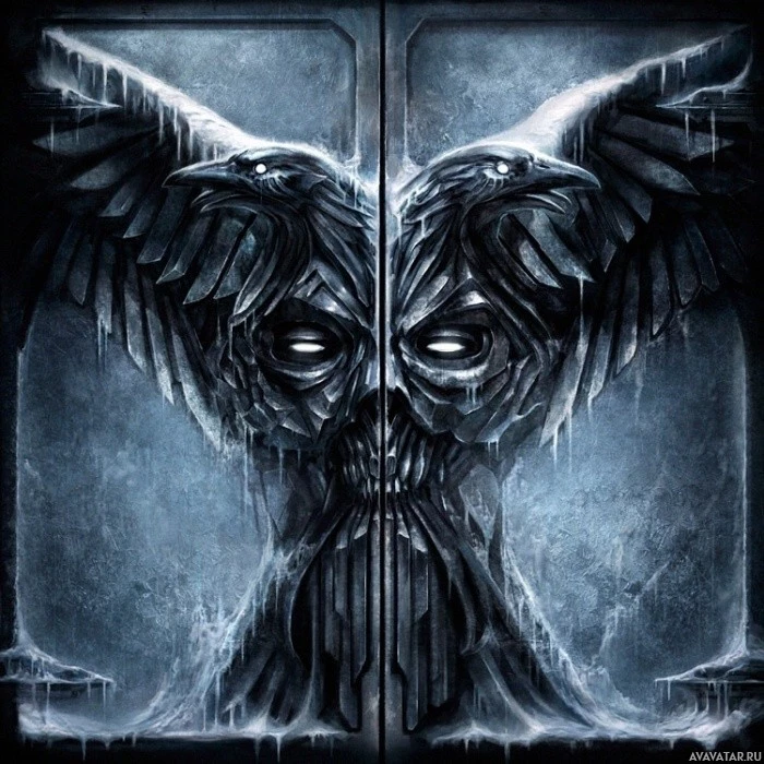 skull face with the ominous surroundings. The use of crow-like elements may suggest a connection to mythology, as crows are often associated with intelligence, transformation, and sometimes even death in various