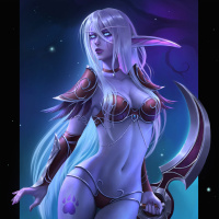 white hair, pointed ears, and wearing armor with a dark skin tone. The character is holding a large sword or scythe-like weapon, suggesting she might be from a fantasy setting where magic and swords are common. Her pose and expression convey confidence and readiness for battle.