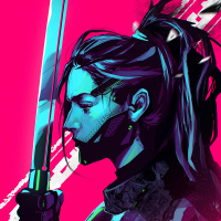 The image features an illustration of a character who appears to be a girl. She is depicted holding a sword with both hands, suggesting that she may be involved in some form of combat or warrior role. Her expression is serious and contemplative, which adds to the overall