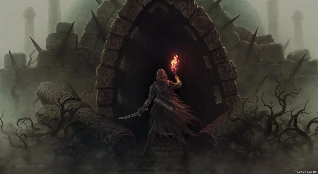 the center of the composition is a figure who seems to be crouched down, holding a torch that is casting light into the surrounding darkness. The figure is also holding what looks like a sword or similar weapon. There are skeletal remains scattered around, and the overall atmosphere suggests a scene of supernatural horror or