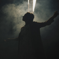 The image features a person standing with their arms outstretched, as if they are singing or performing. There is