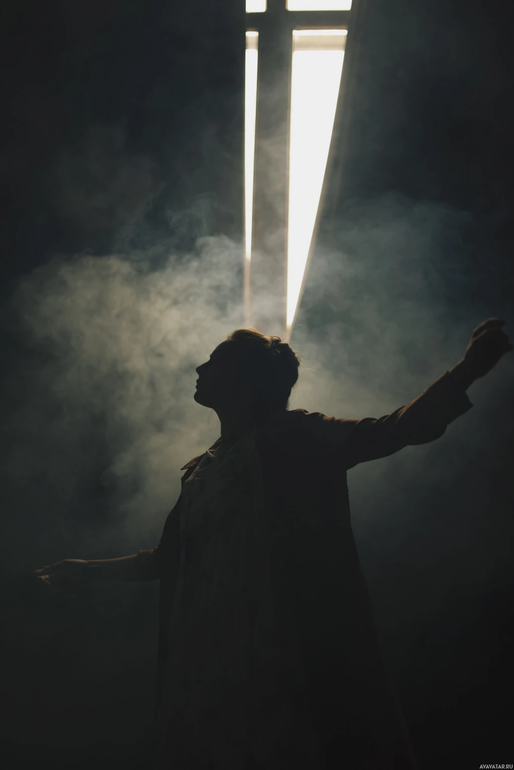 a silhouette effect applied to the person, making it difficult to discern specific details about them. The background appears to be a dark, dimly