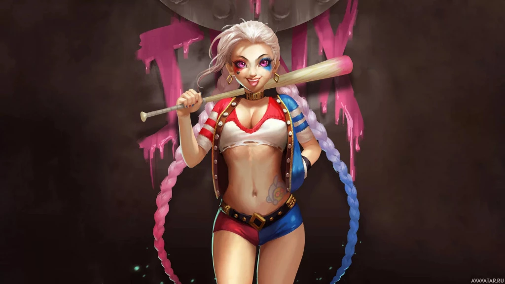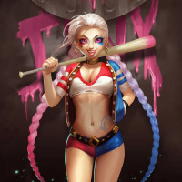 Harley Quinn, known for her role in the DC Comics universe. She is depicted holding what appears to be