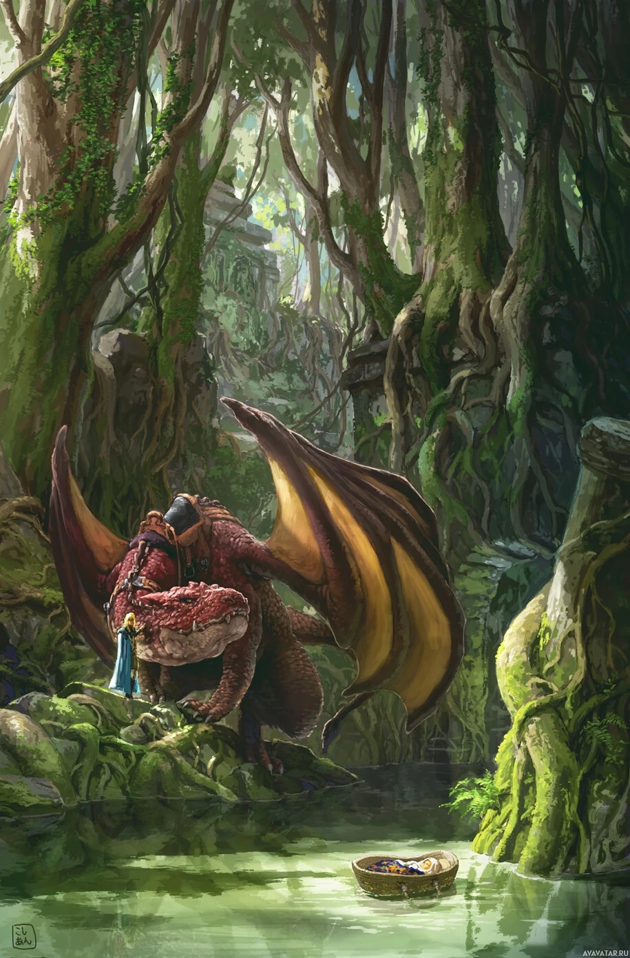 a fantasy scene with a human-like figure on the ground and a large, friendly dragon standing beside them. The setting appears to be in a jungle or forest environment, characterized by dense vegetation, rocks, and a small