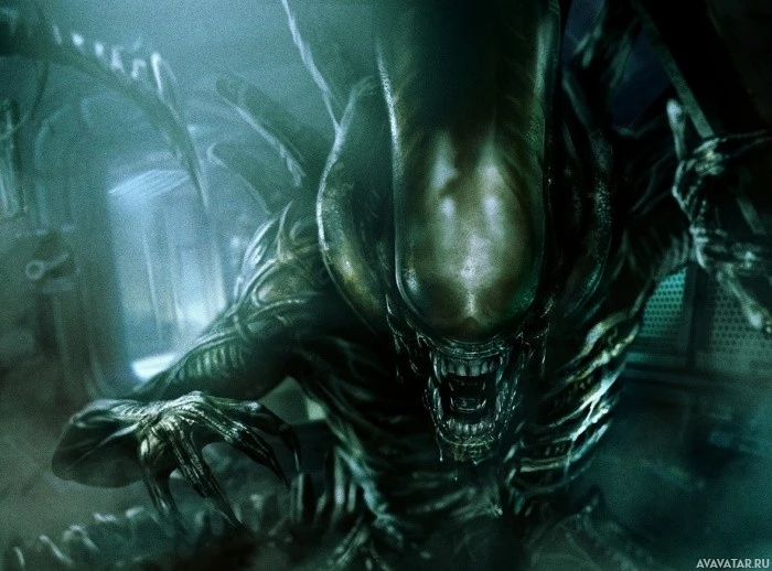 film series, specifically featuring one of the iconic Alien creatures. It is set in a dark corridor with