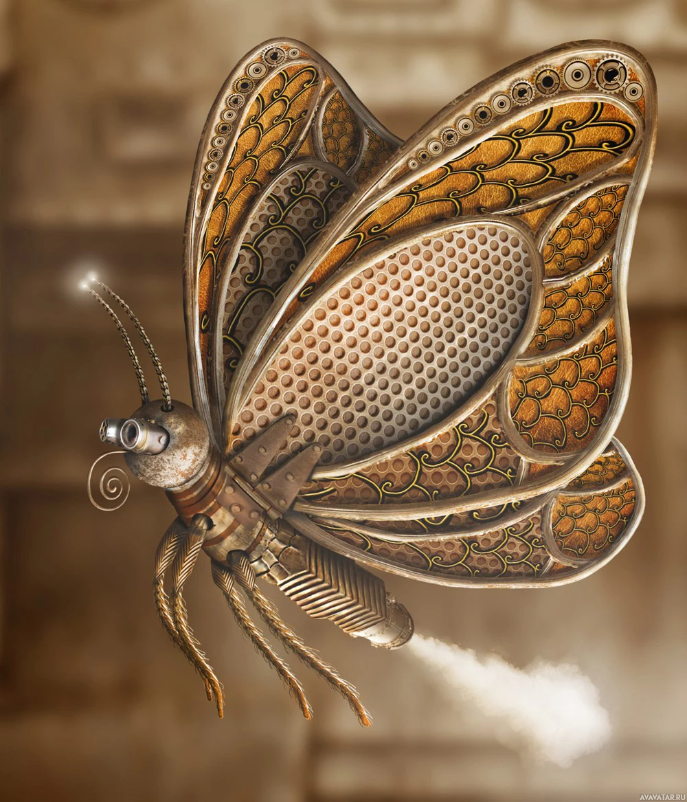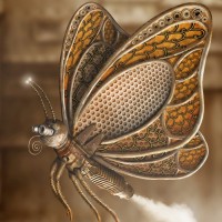 color gradients and patterns, while its head appears to be a cog or gear-like structure, which gives it a steampunk appearance. The butterfly is also shown with what seems like metallic legs and antennae, suggesting some sort of