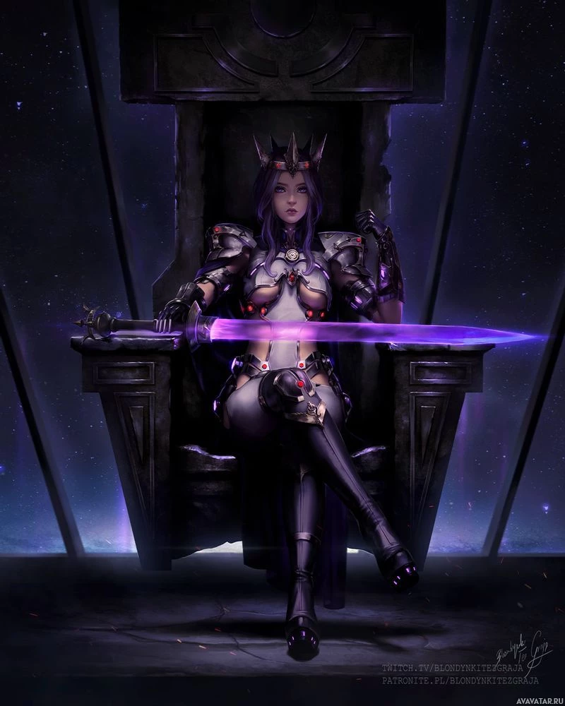 a purple blade. The setting appears to be a throne room with