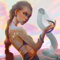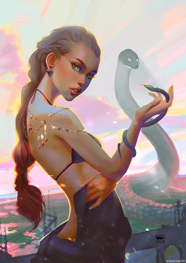 red hair and is wearing a black top with what looks like a tattoo or body art on her shoulder. In her left hand, she holds a snake-like creature with
