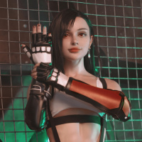 character design that may suggest she is dressed as a superheroine or a similar type of character. The setting includes industrial or urban elements such as fencing or grating in the background.