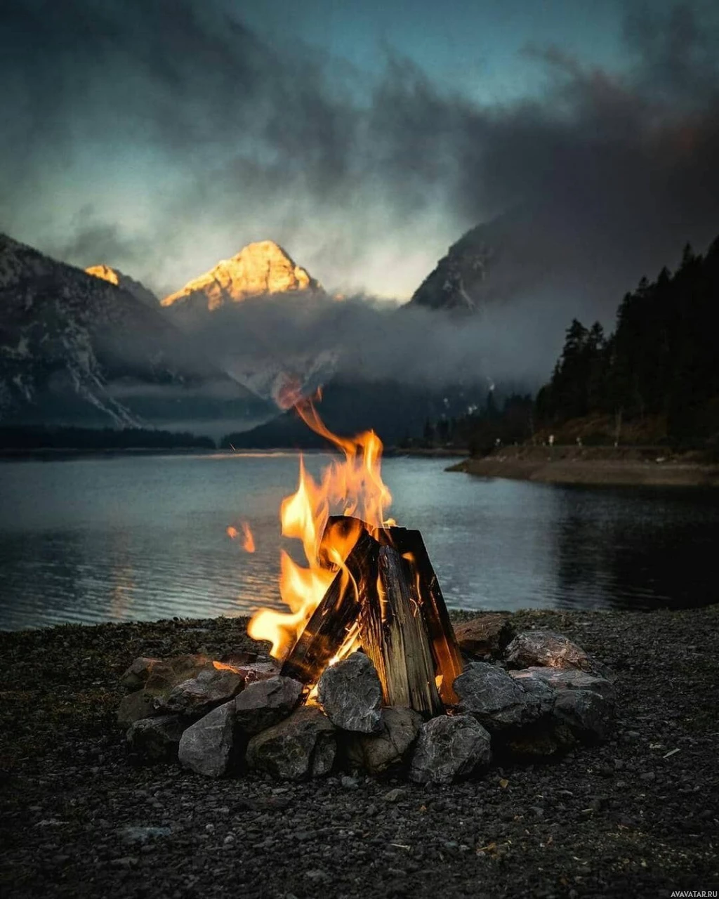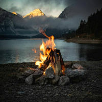 The picture shows a campfire with flames burning brightly, situated on the shore of what appears to be a lake. In the background, there's