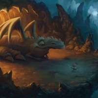 Картинка показывает фантастическую сцену с большим, дружелюбно выглядящим драконом. Он расположен в пещере или подземной пещере с скальными образованиями, видимыми на заднем плане. Есть также небольшое существо, которое кажется птицей, сидящей у края пещеры, глядя на дракона. Освещение предполагает, что это может быть рассвет или сумерки из-за мягкого освещения, поступающего из-за входа в пещеру.