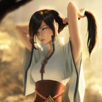 a young girl with brown hair. She is depicted wearing a traditional-style outfit that includes a blouse, skirt, and what seems to be an accessory or headband. Her posture and expression suggest a thoughtful or contemplative mood. The background suggests