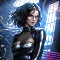 the video game or media "Assassin's Creed," known for its female protagonist dressed in a black combat suit. The character is depicted with