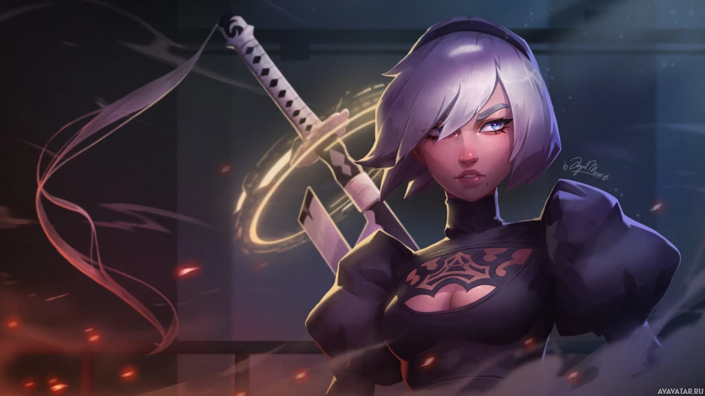the video game "Nier: Automata." She is depicted wielding a sword and has