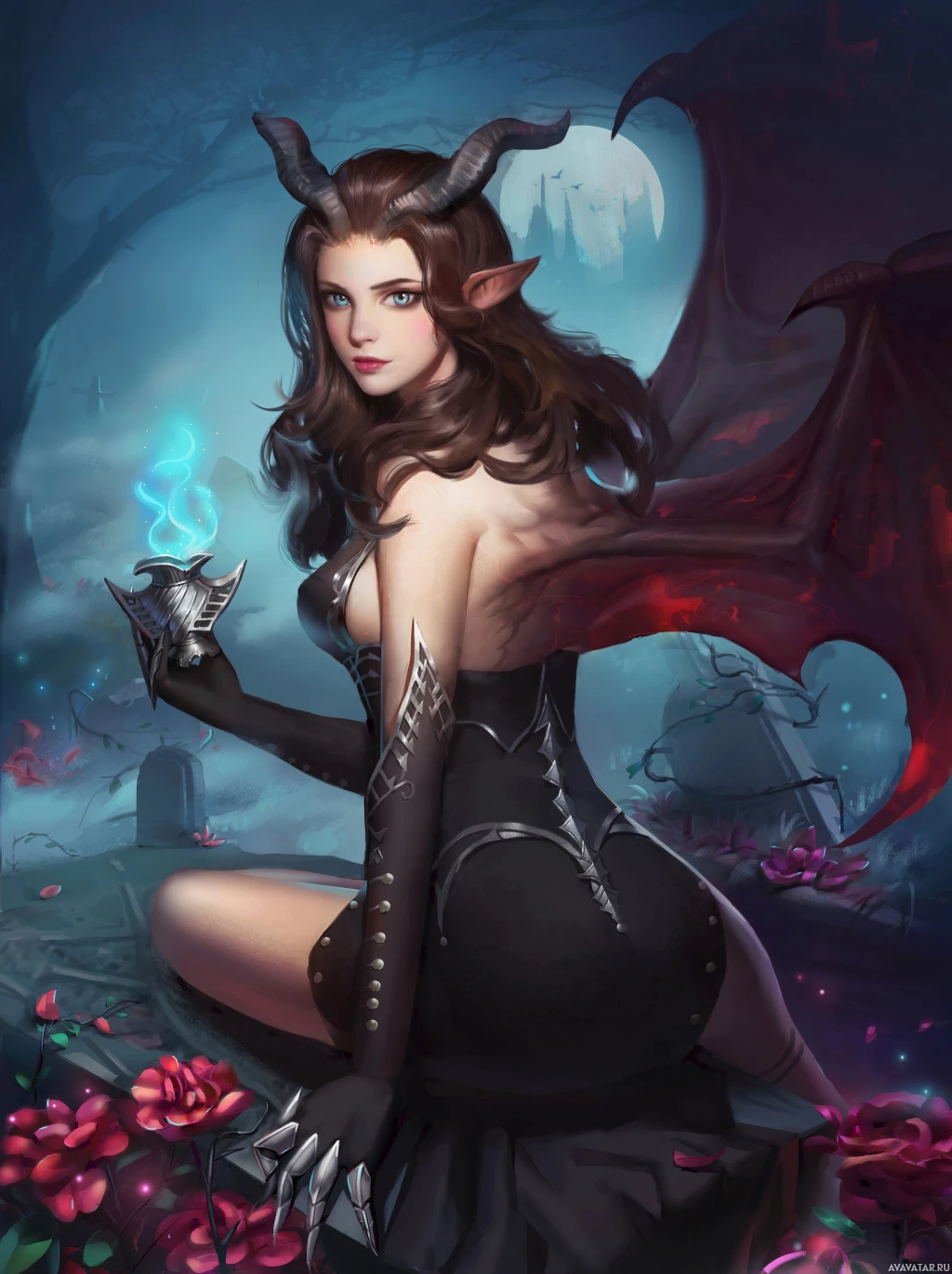 a fantasy character who appears to be a succubus. She is seated among what looks like