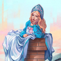 blonde hair, dressed in attire that suggests she might be a princess or a fairy tale-style figure. She is seated on what looks like