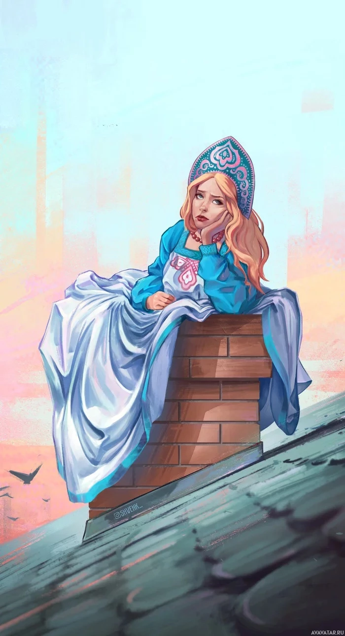a brick structure, possibly part of a building or a wall, and her expression seems contemplative or melancholic. The background has a soft, pastel color palette with hints of blue and pink, which could indicate the scene takes place at dawn or dusk due to